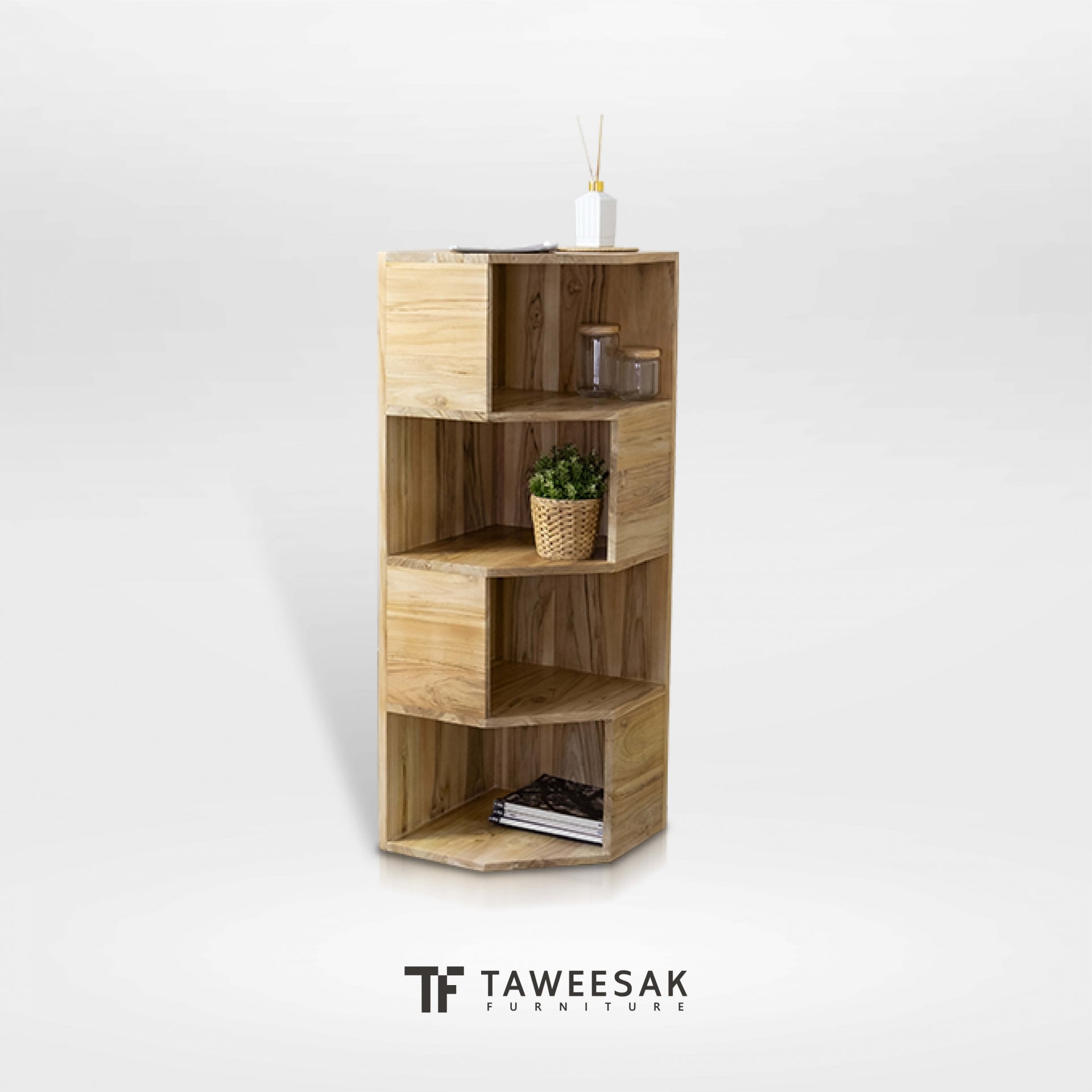 เป็นลักษณะของชั้นวางของที่ดีไซน์ออกมาเพื่อเพิ่มพื้นที่ใช้สอยบริเวณมุมห้องให้เกิดประโยชน์ได้เป็นอย่างมาก เราสามารถเลือกใช้ชั้นวางของแบบเข้ามุมกับห้องนั่งเล่น จัดเป็นมุมหนังสือ วางอุปกรณ์ของใช้สัตว์เลี้ยงตัวโปรด หรือแม้กระทั่งชั้นวางในห้องน้ำเอง ก็มีการดีไซน์แบบเข้ามุม เพื่อเพิ่มพื้นที่สำหรับวางของในห้องน้ำเช่นกัน