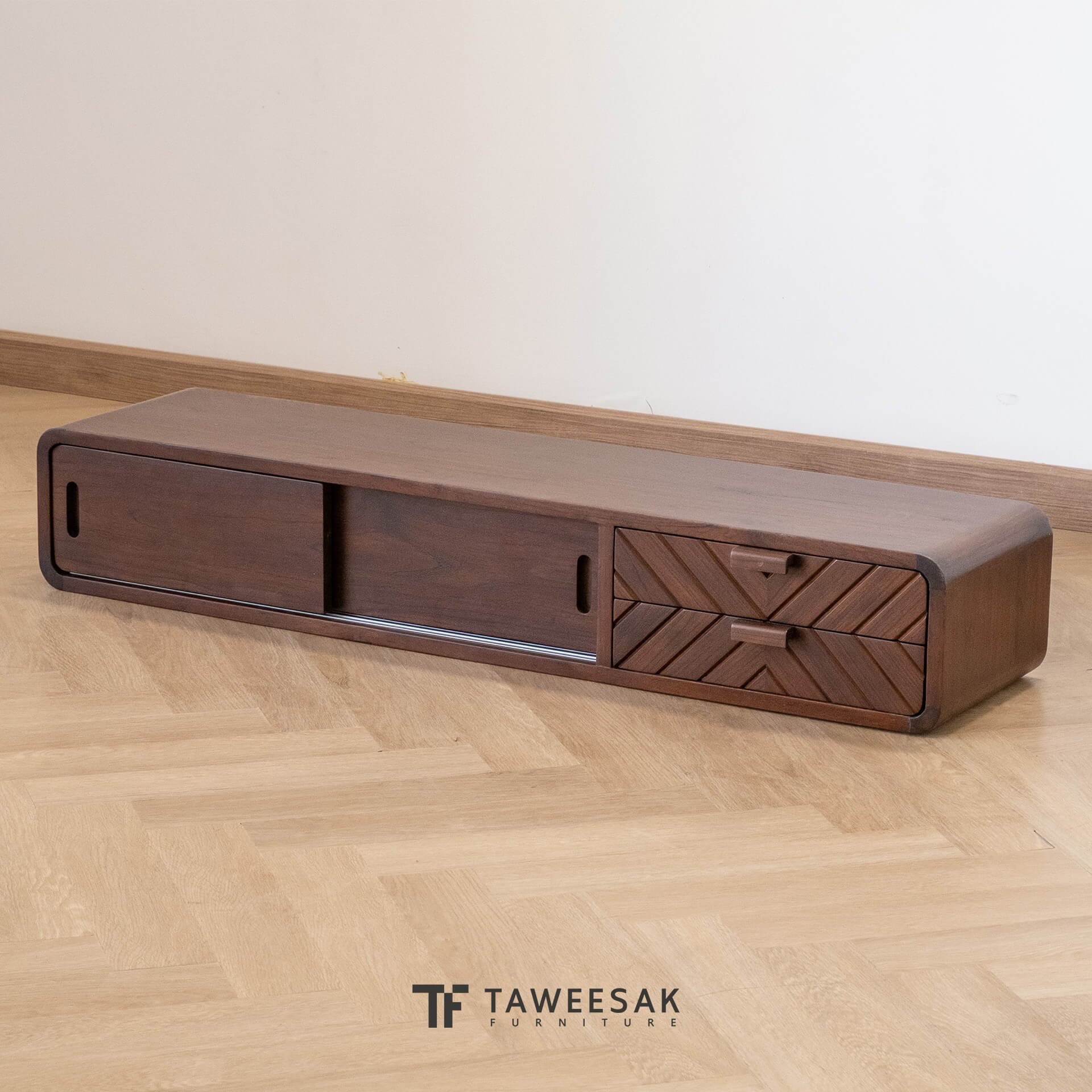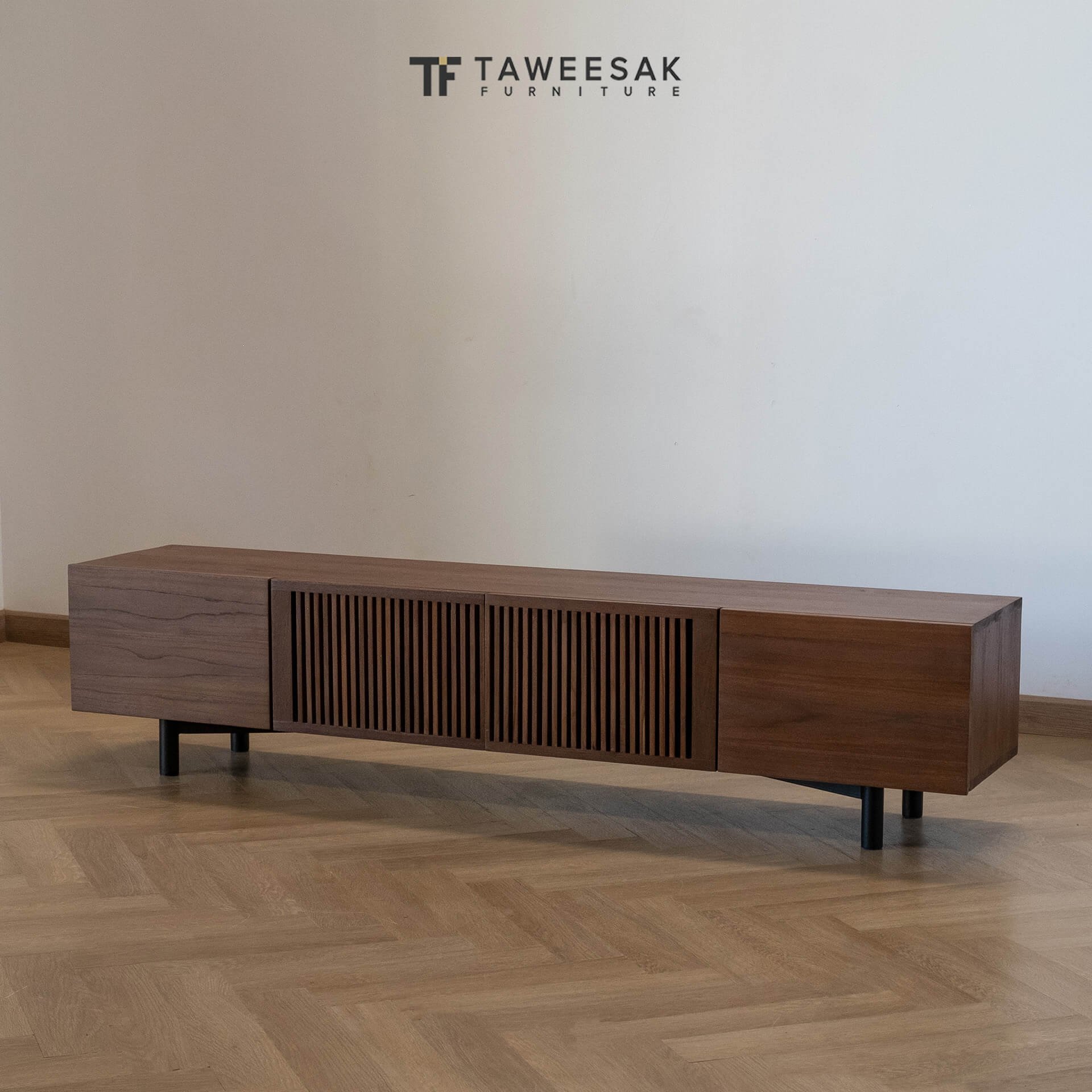 เริ่มต้นด้วยชั้นวางทีวีที่มาในสไตล์เคร่งขรึมด้วยโทนสีเข้มของตัวไม้ ทำให้เหมาะสำหรับการตกแต่งในบ้านในสไตล์ลอฟท์หรือบ้านที่มีสีโทนเข้ม แม้อาจจะให้ความรู้สึกว่ามีขนาดค่อนข้างเล็ก แต่ที่จริงแล้วมีความยาวมากถึง 220 เซนติเมตร สามารถวางทีวีขนาด 98 นิ้วได้เลยสบาย ๆ และยังมาพร้อมกับพื้นที่สำหรับจัดเก็บสิ่งของ จำพวกกล่องรับสัญญาณ หรือ เราเตอร์ WiFi ไม่ให้วางระเกะระกะรบกวนสายตาอีกด้วย