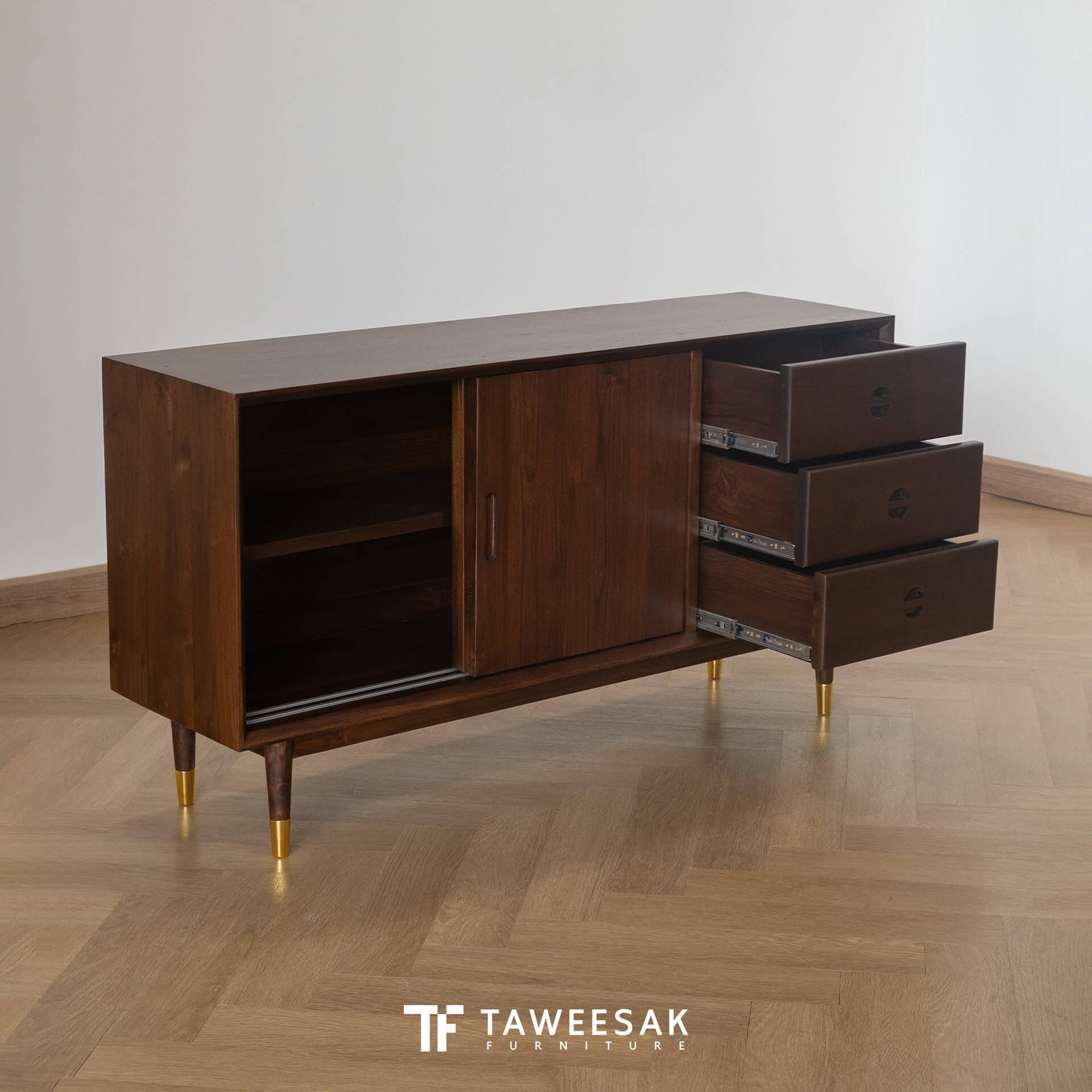 สำหรับผู้ที่มีสิ่งของอยากจะจัดเก็บเยอะเป็นพิเศษในบริเวณที่ใช้ดูทีวี ตู้วางทีวีรุ่นนี้น่าจะเหมาะสำหรับคุณ เพราะมีฟังก์ชันการใช้งานเป็นทั้ง ชั้นวางทีวี และ ตู้ไซด์บอร์ด มีพื้นที่จัดเก็บเป็น 2 บานเลื่อนกับ 3 ลิ้นชัก ดีไซน์ค่อนข้างมีกลิ่นอายของความคลาสสิค และเนื่องจากถูกสร้างด้วยไม้สัก ความมั่นคง แข็งแรง จึงไม่ใช่สิ่งที่ต้องกังวล สามารถวางทีวีได้สูงสุดที่ขนาด 65 นิ้ว