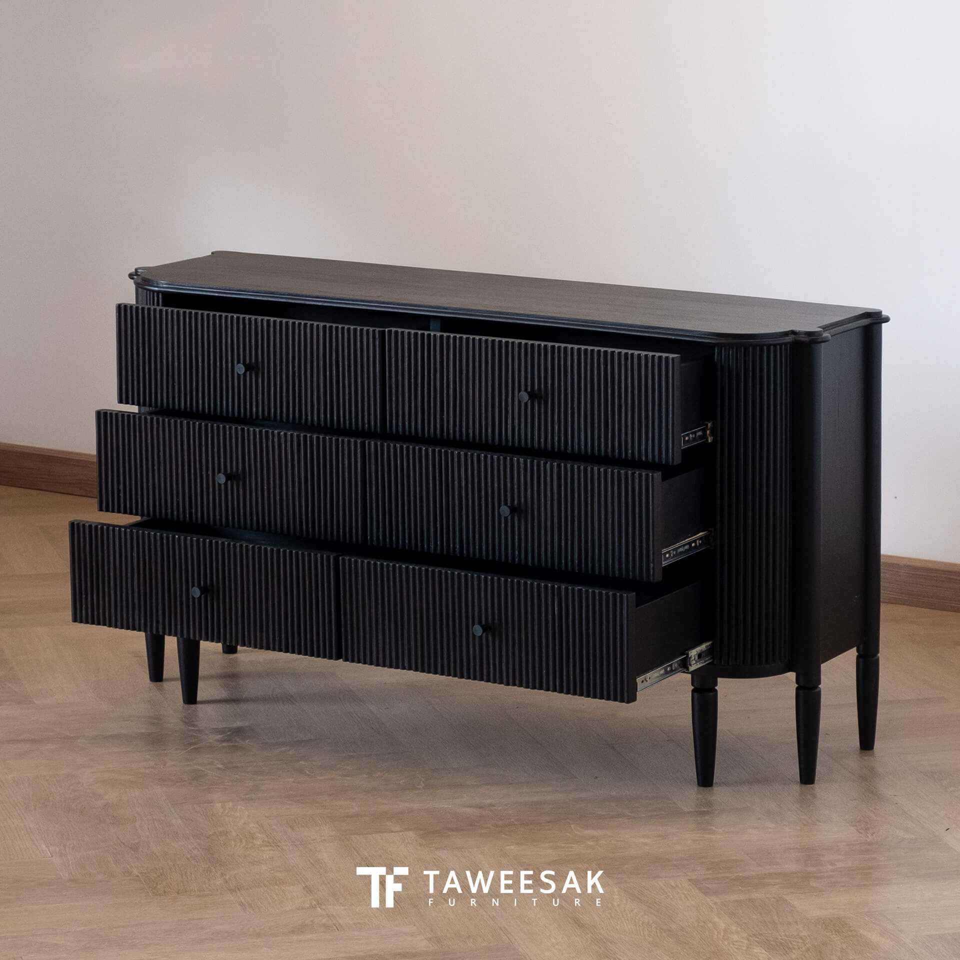 ตู้วางทีวีไม้สักคลาสสิครุ่นนี้เป็นชั้นวางทีวีที่เหมาะสมสำหรับคุณผู้ชายเป็นที่สุด เนื่องจากโทนสีที่ออกจะดำสนิทของตัวไม้ พร้อมด้วยดีไซน์ที่สุดแสนจะคลาสสิค อาจไม่เหมาะที่จะไปตั้งในบ้านสไตล์โมเดิร์นสักเท่าไหร่ และด้วยพื้นที่จัดเก็บซึ่งมีมาให้ถึง 6 ลิ้นชัก จึงเพิ่มฟังก์ชันด้านการใช้งานให้เพิ่มมากขึ้น ด้วยขนาดของชั้นวางทีวีรุ่นนี้ เหมาะกับทีวีที่มีขนาดไม่เกิน 65 นิ้ว หากจับคู่กับเฟอร์นิเจอร์ไม้สไตล์คลาสสิคชิ้นอื่น ๆ น่าจะทำให้บรรยากาศของบ้านดูดีมากขึ้นอย่างแน่นอน