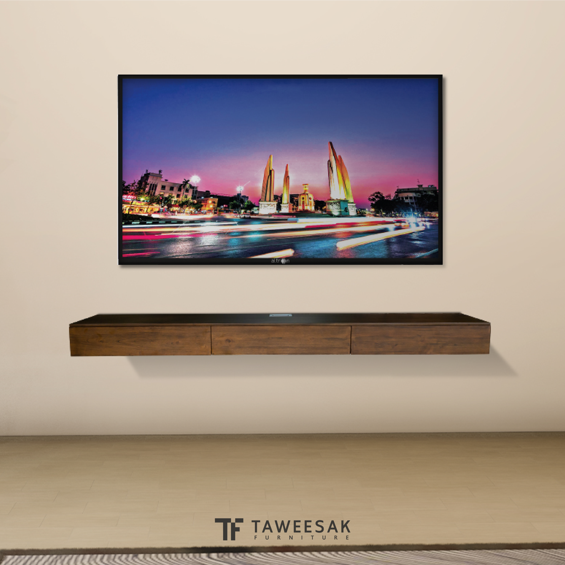 หากเป็นบ้านที่ไม่อยากเปลืองพื้นที่ การเลือกใช้ชั้นวางทีวีติดผนัง ก็เป็นตัวเลือกที่ค่อนข้างน่าสนใจ โดยชั้นวางทีวีรุ่นนี้ถูกออกแบบด้วยดีไซน์ที่ทันสมัย ใช้วัสดุเป็นไม้อัดแท้ 100% สามารถใช้ได้กับทีวีขนาดใหญ่ได้ มีลูกเล่นสำหรับการจัดเก็บสายไฟ ช่วยทำให้พื้นที่บริเวณทีวีดูสบายตา มีลิ้นชักสำหรับเก็บรีโมททีวีหรือของใช้ต่าง ๆ และสามารถเลือกระดับความสูงสำหรับการติดตั้งให้เหมาะกับระดับสายตาได้ตามต้องการ