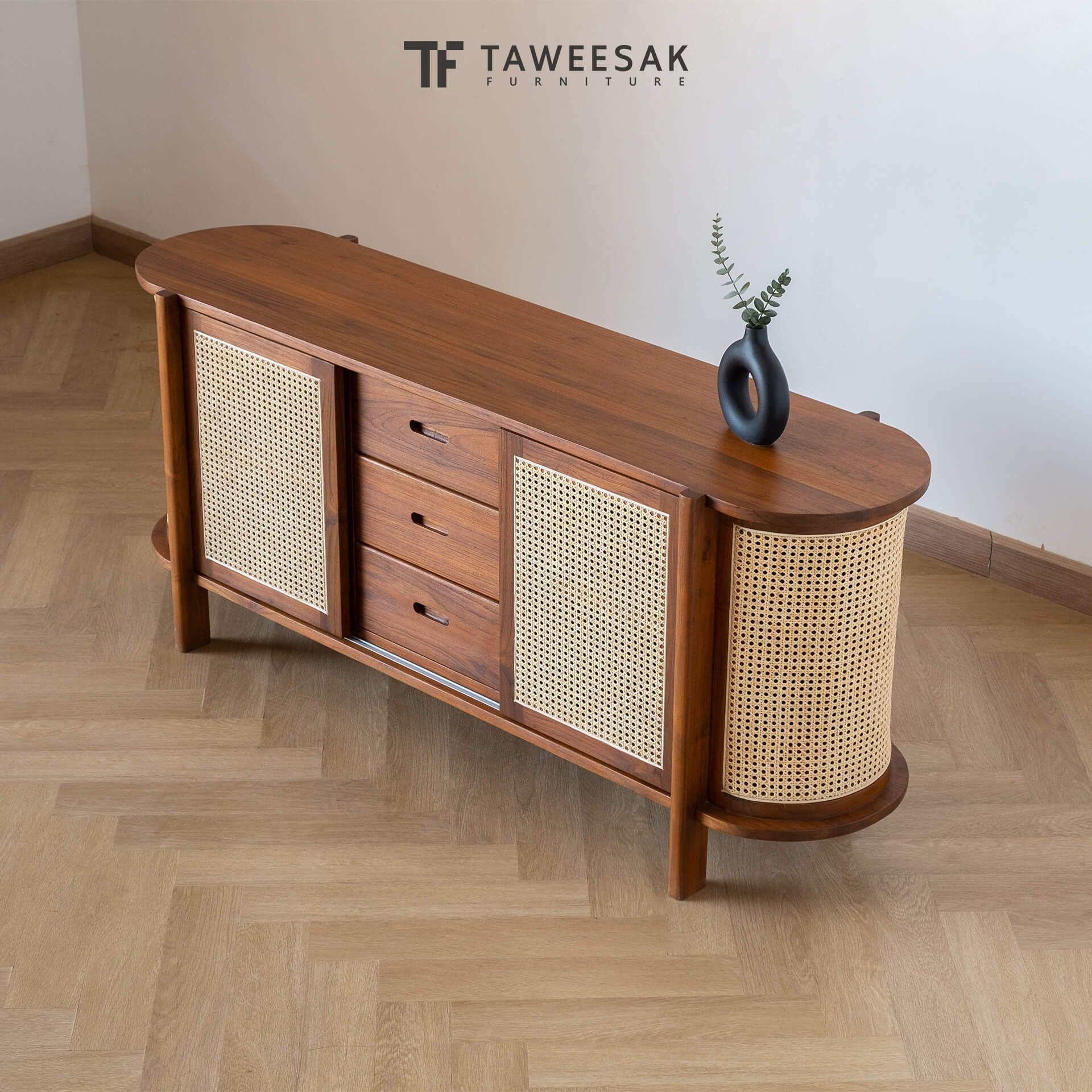 ตู้วางทีวีไม้สักบานเลื่อนหวายคือชั้นวางทีวีมินิมอลที่ผสมผสานการออกแบบสไตล์เก่าแก่ได้อย่างลงตัว โดยการใช้ชิ้นส่วนของไม้สักผสมผสานกับการหวายสาน มีสีให้เลือกหลายรูปแบบ จะเป็นสีโทนอ่อนสำหรับบ้านสไตล์มินิมอล หรือ สีโทนเข้มสำหรับบ้านสไตล์ลอฟท์ ก็สามารถเลือกให้เข้ากันได้อย่างลงตัว ในส่วนของการใช้งาน นอกจากขนาดของโต๊ะที่ค่อนข้างใหญ่ รองรับการวางทีวีขนาดใหญ่ พร้อมด้วยพื้นที่สำหรับเก็บของจำนวน 3 ลิ้นชัก พร้อมบานเลื่อนด้านหลัง ส่งผลให้เป็นชั้นวางทีวีที่มีฟังก์ชันการจัดเก็บสิ่งของที่ค่อนข้างอเนกประสงค์เลยทีเดียว