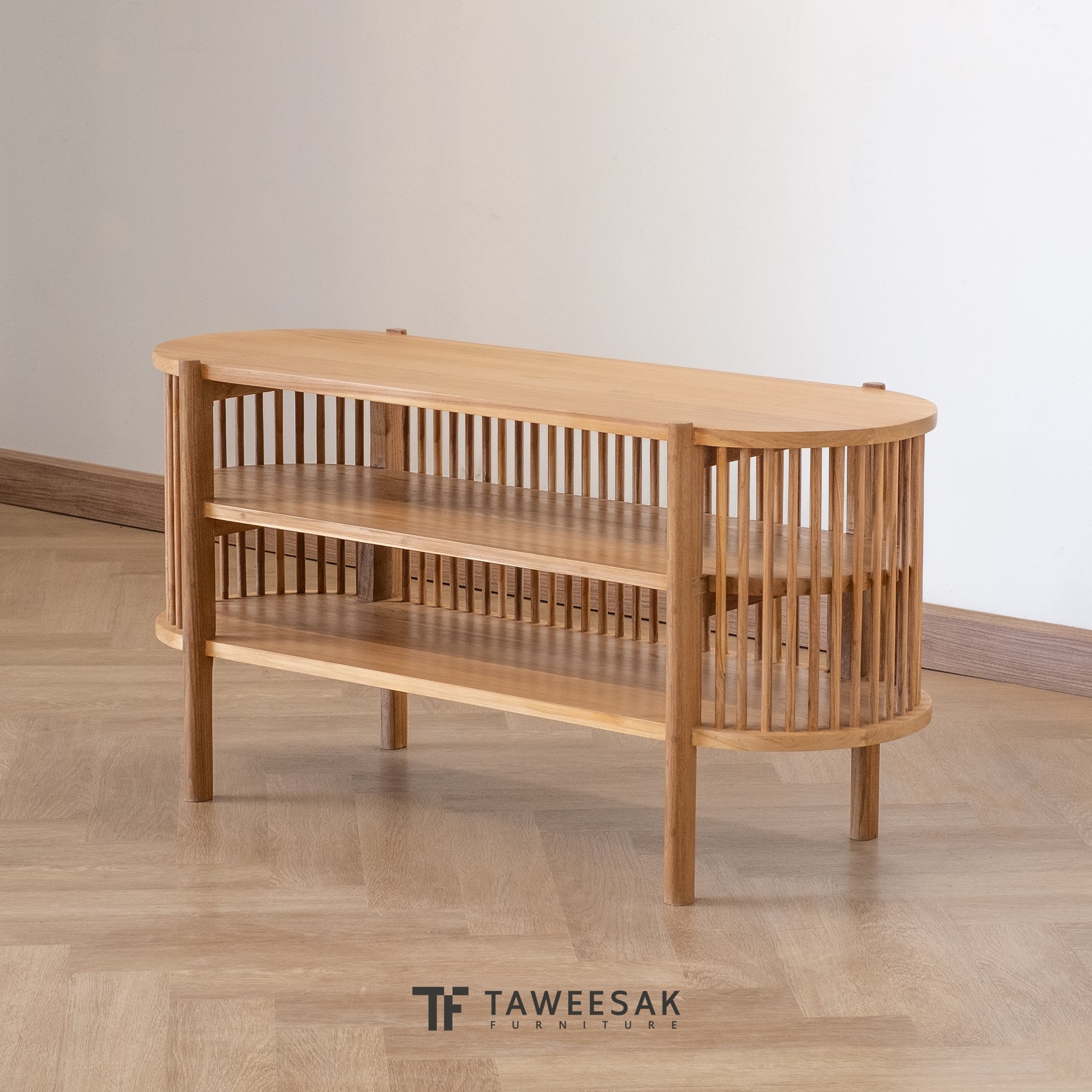 นี่คือชั้นวางทีวีไม้แท้ที่สามารถถ่ายทอดดีไซน์โชว์ความสวยงามของไม้สักไทยได้อย่างชัดเจน ถ้ามองจากไกล ๆ จะเหมือนกับการนำเอาไม้สักมาวางกองซ้อน ๆ กันเอาไว้ ในส่วนของพื้นที่จัดเก็บค่อนข้างกว้างขวาง เหมาะสำหรับผู้ที่อยากจัดเก็บสิ่งของให้เป็นระเบียบเรียบร้อย และที่โดดเด่นที่สุดของชั้นวางทีวีรุ่นนี้ คงเป็นอะไรไปไม่ได้นอกจากดีไซน์อันเป็นเอกลักษณ์ สามารถนำมาวางไว้ในห้องนั่งเล่นหรือห้องรับแขกได้เลย เชื่อว่าใครได้เห็นเป็นครั้งแรกย่อมสะดุดตาอย่างแน่นอน