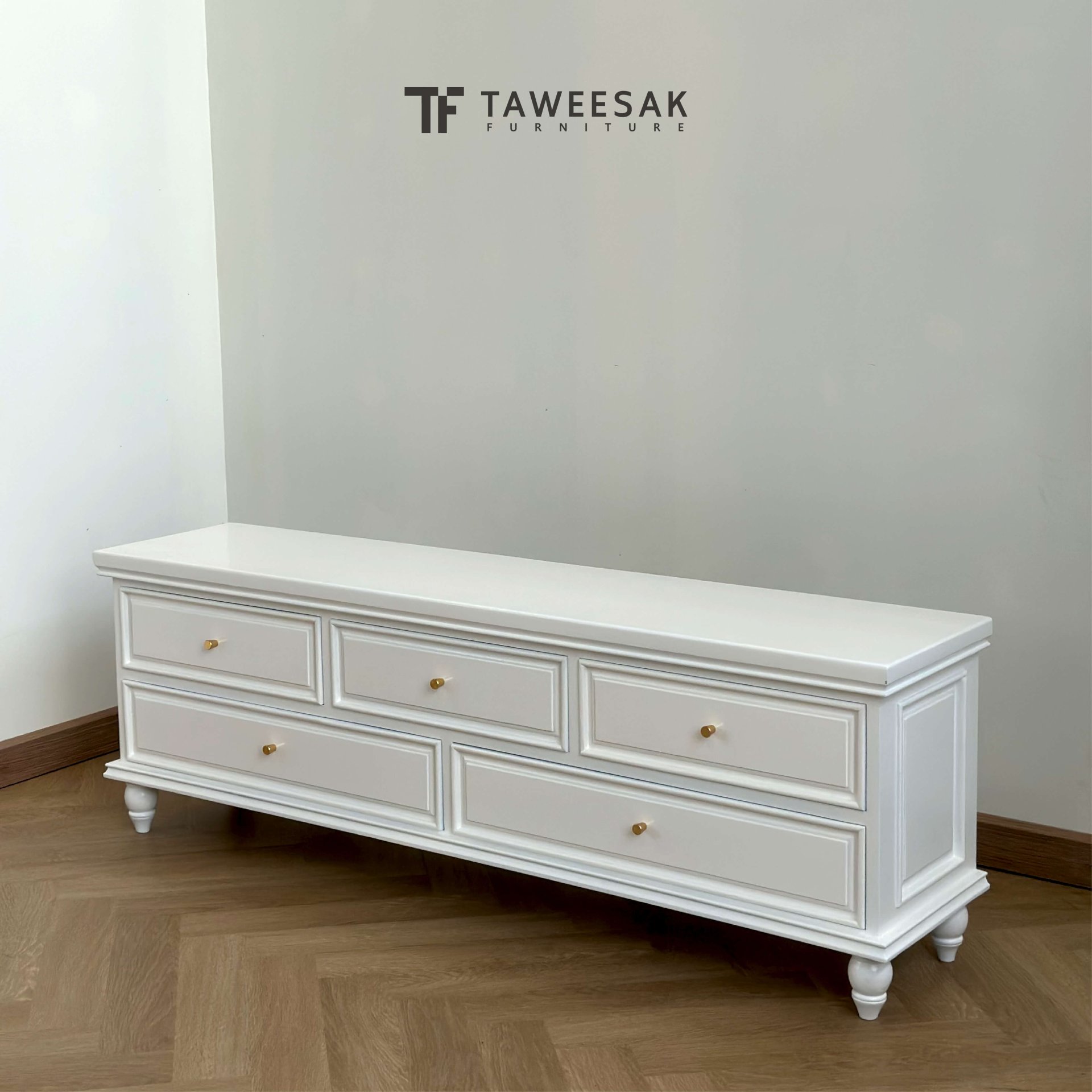 Taweesak Furniture ไม่ได้มีแค่เฟอร์นิเจอร์ที่เน้นลายไม้ชัด ๆ อย่างเดียวเท่านั้น เพราะยังมีการออกแบบชั้นวางทีวีสวย ๆ ในสไตล์อื่น ๆ อีกมากมาย ยกตัวอย่างเช่น ชั้นวางทีวีรุ่นนี้ ซึ่งมีการดีไซน์ให้ออกมาในรูปแบบโมเดิร์น คลาสสิค มีสีขาวนวล มีลิ้นชักสำหรับเก็บของถึง 5 ลิ้นชัก เหมาะสำหรับบ้านที่มีการตกแต่งในสไตล์หรูหราลักชูรี สามารถใช้วางทีวีได้ขนาดใหญ่สุดถึง 75 นิ้ว