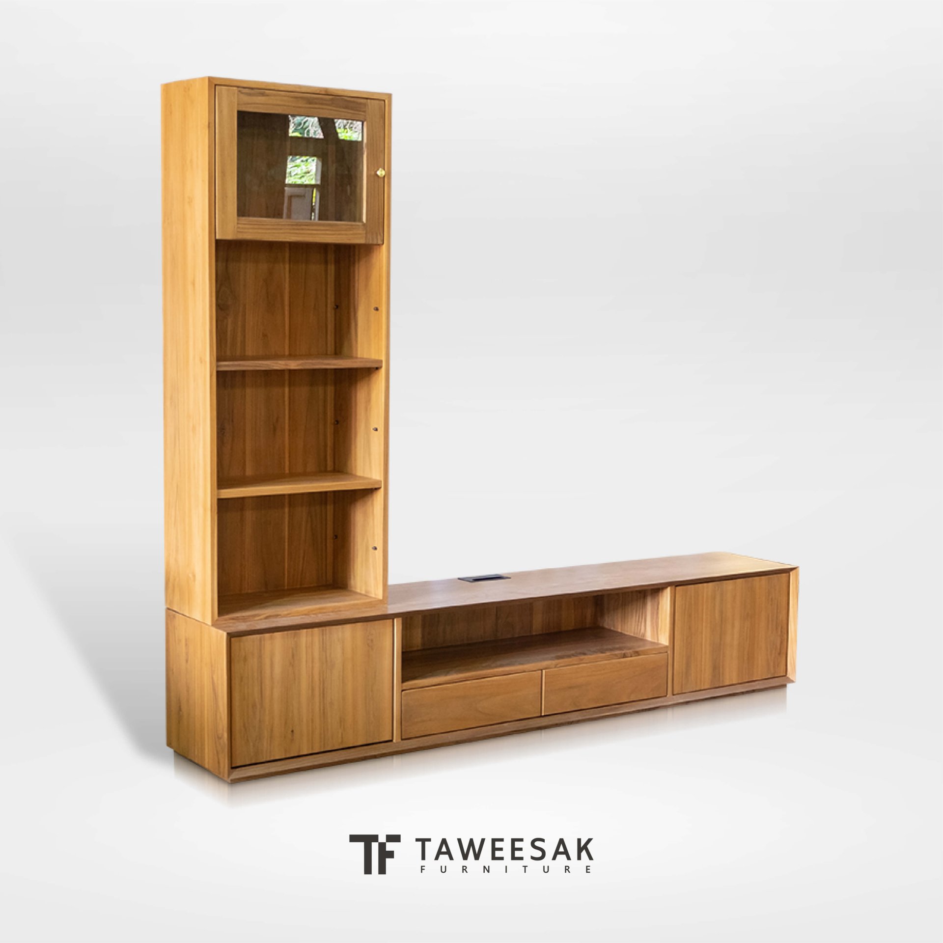ขอปิดท้ายด้วยตู้วางทีวีไม้สักแท้ที่ผลิตจากไม้สักประเทศไทยที่ผ่านการอบแห้งด้วยเตาอบไม้ ทำให้แข็งแรง ทนทาน และดูแลรักษาง่าย มีขนาดกว้าง 40 ซม. ยาว 180 ซม. และสูง 75 ซม. ประกอบด้วย 2 ประตูพร้อมมือจับหน้าบานและลิ้นชักเซาะร่อง รวมถึงชั้นวางสำหรับซีดีหรือเครื่องเล่น เหมาะสำหรับการจัดวางทีวีและอุปกรณ์บันเทิงต่าง ๆ ในบ้าน มีความเรียบหรูดูดี เหมาะกับทุกสไตล์การตกแต่งบ้านอย่างแน่นอน