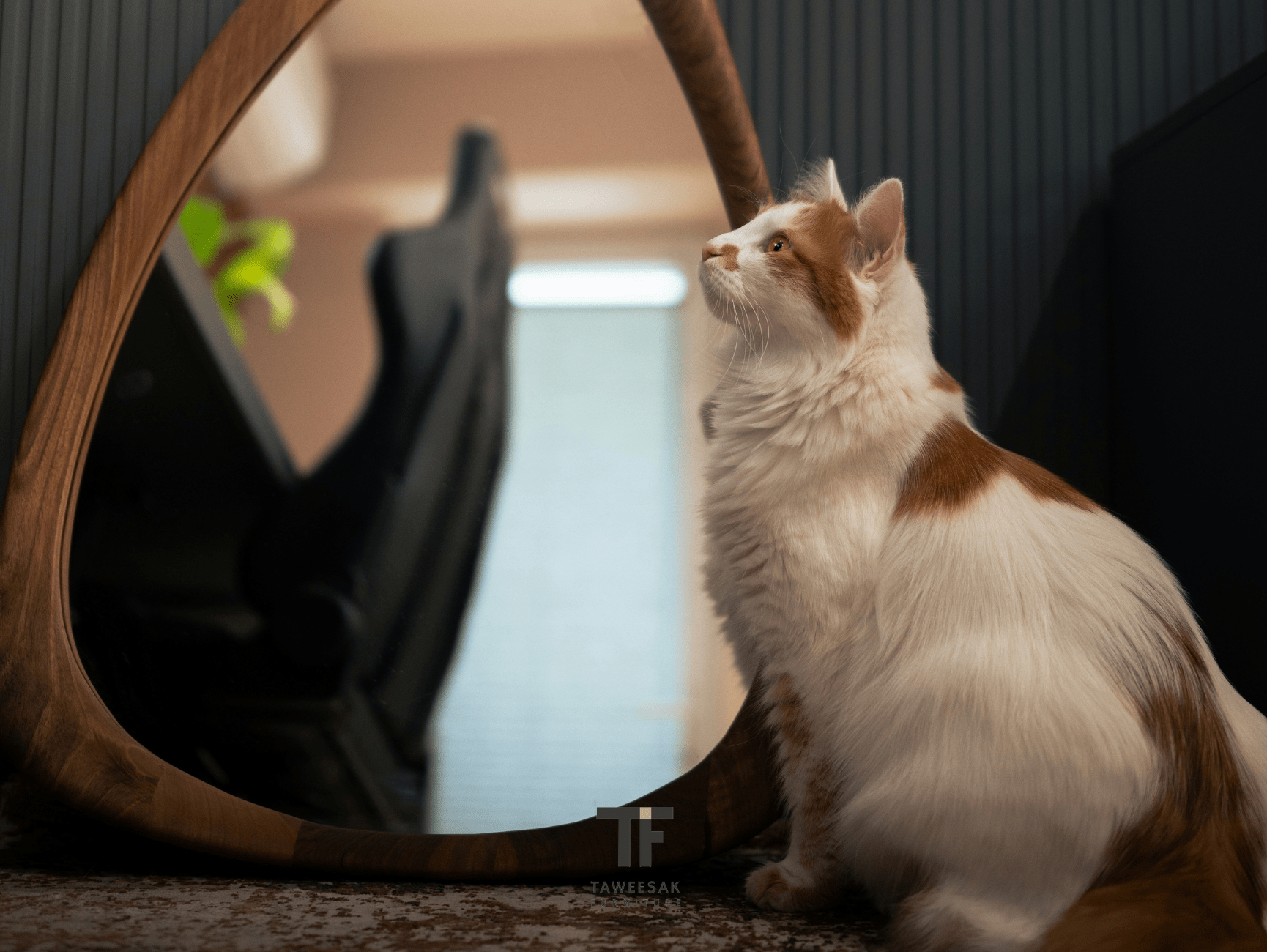 ด้วยนิสัยที่ขี้เล่น ขี้สงสัย ในบางครั้งเมื่อเจ้าตัวได้เห็นเงาของตนเองที่สะท้อนอยู่ในกระจก ก็อาจจะสงสัยว่า เอ็งเป็นใครหว่า? บางครั้งแมวก็จะยืนจ้องอยู่หน้ากระจกให้เราเห็นอยู่บ่อย ๆ บางทีก็มีการออกท่าออกทางเหมือนเล่นกับเงาในกระจก เพราะฉะนั้นการจัดห้องเลี้ยงแมว ถ้ามีกระจกบานใหญ่ ๆ หรือ เฟอร์นิเจอร์ที่มีกระจก ก็จะช่วยให้เจ้าเหมียวรู้สึกสนุกตื่นเต้นและคลายเหงาได้ แต่ต้องมีการติดตั้งที่มั่นคง ไม่ควรวางเอาไว้เฉย ๆ โดยเด็ดขาด ใครเป็นทาสแมวมานานน่าจะรู้ดีว่า เจ้าเหมียวนั้นเก่งในเรื่องการทำข้าวของเสียหายมากแค่ไหน