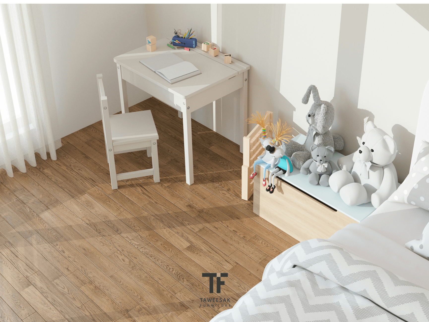 อย่าลืมจัดมุมเล็ก ๆ สำหรับกิจกรรมเสริมสร้างจินตนาการของลูกด้วยการมีพื้นที่เฉพาะสำหรับทำกิจกรรมจะช่วยให้เด็กได้ใช้เวลาอย่างมีคุณภาพ และรู้สึกผูกพันกับห้องของตัวเองมากยิ่งขึ้น ขอแนะนำ ชุดโต๊ะเครื่องแป้งมินิมอลไม้สักบุหวาย DT041 ด้วยขนาดที่เล็กกะทัดรัด ทำให้เหมาะสำหรับการนั่งทำกิจกรรมต่าง ๆ ของเจ้าตัวน้อย จะใช้เพื่อเขียนหนังสือ นั่งทานอาหาร หรือ นั่งเล่นของเล่น ก็ทำได้อย่างถนัด