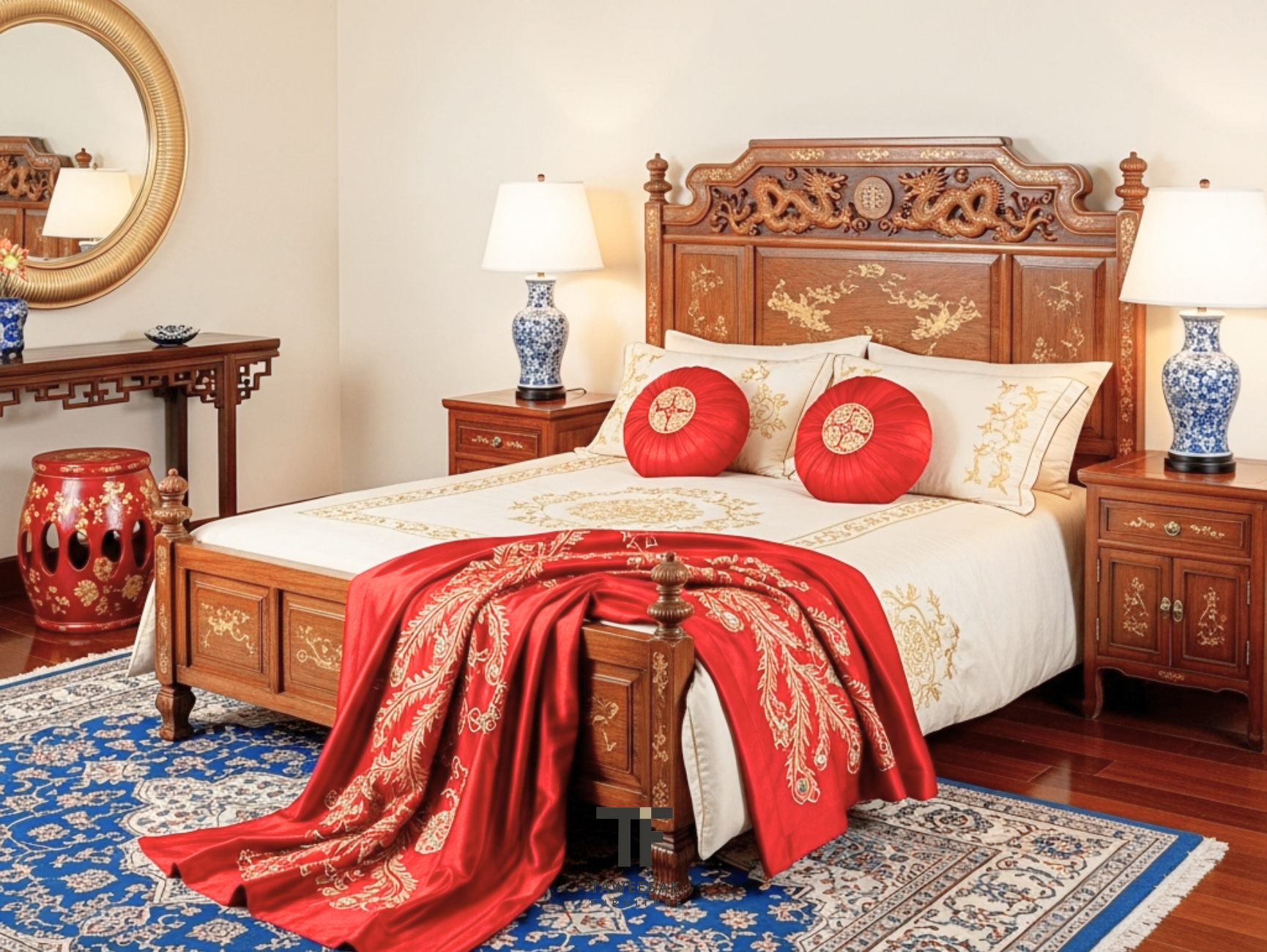 สีแดง: สัญลักษณ์ของความโชคดี ความสุข และความรุ่งเรือง นิยมใช้กับของตกแต่งชิ้นเล็ก ๆ เช่น หมอนอิง พรม แจกัน หรือภาพแขวน เพื่อเพิ่มพลังและความมีชีวิตชีวาให้กับห้อง