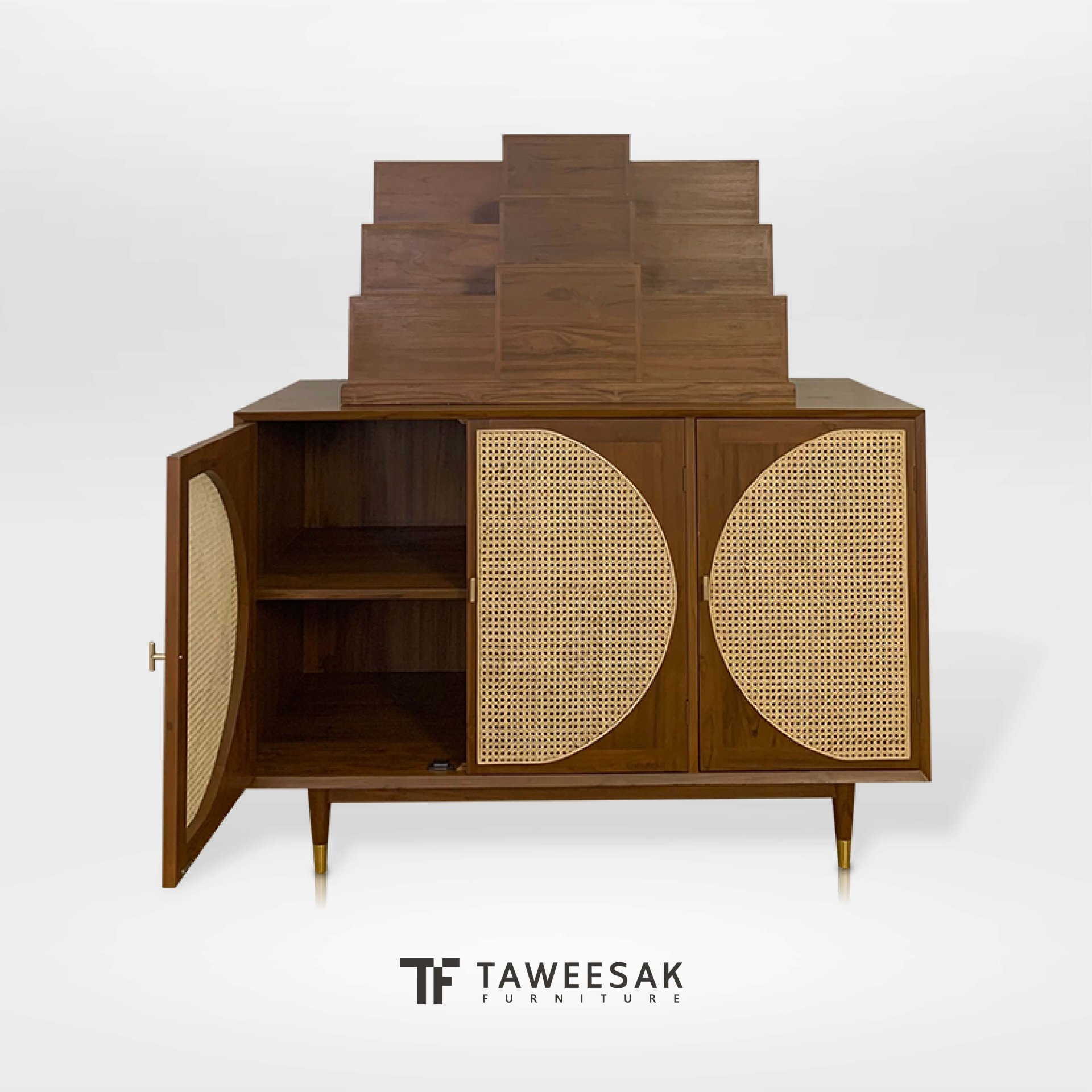 ลักษณะเด่น: ใช้ไม้สักผสานกับงานสานหวายที่หน้าบานตู้ เสริมขาทอง ให้ลุคโต๊ะหมู่บูชามินิมอลที่ดูซอฟต์และทันสมัยที่สุด