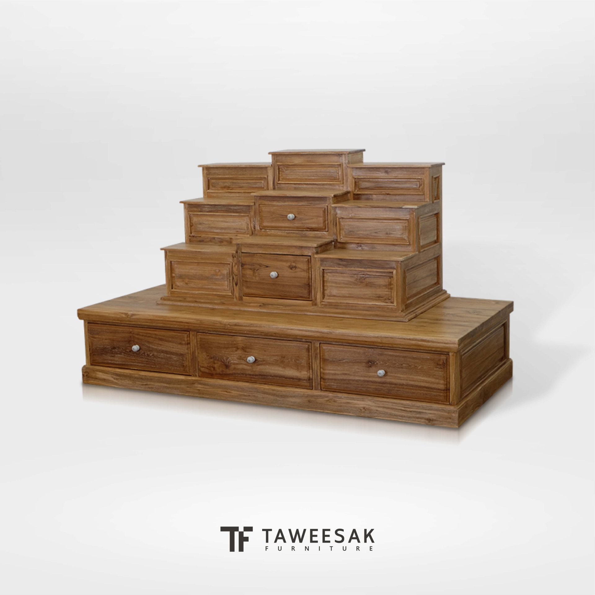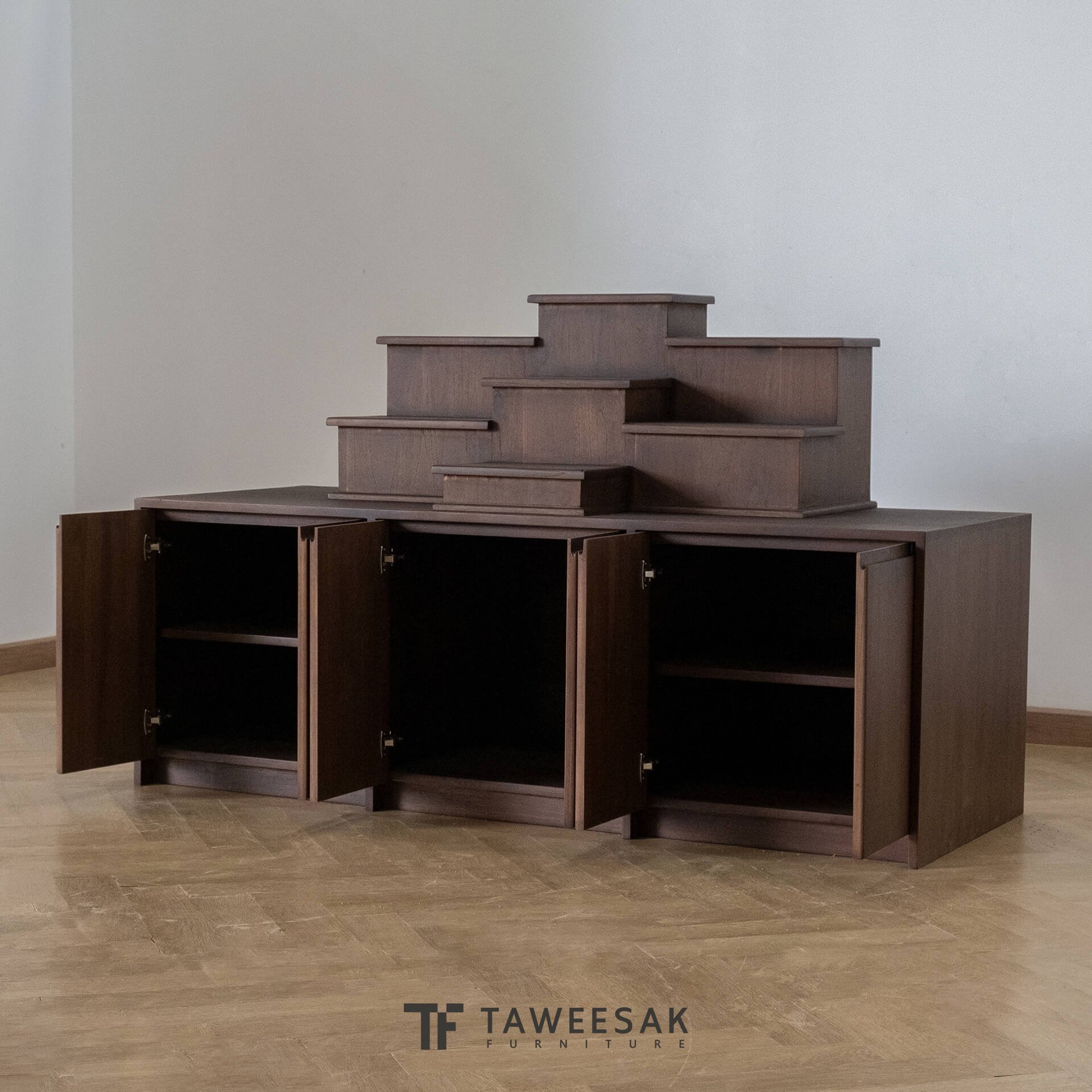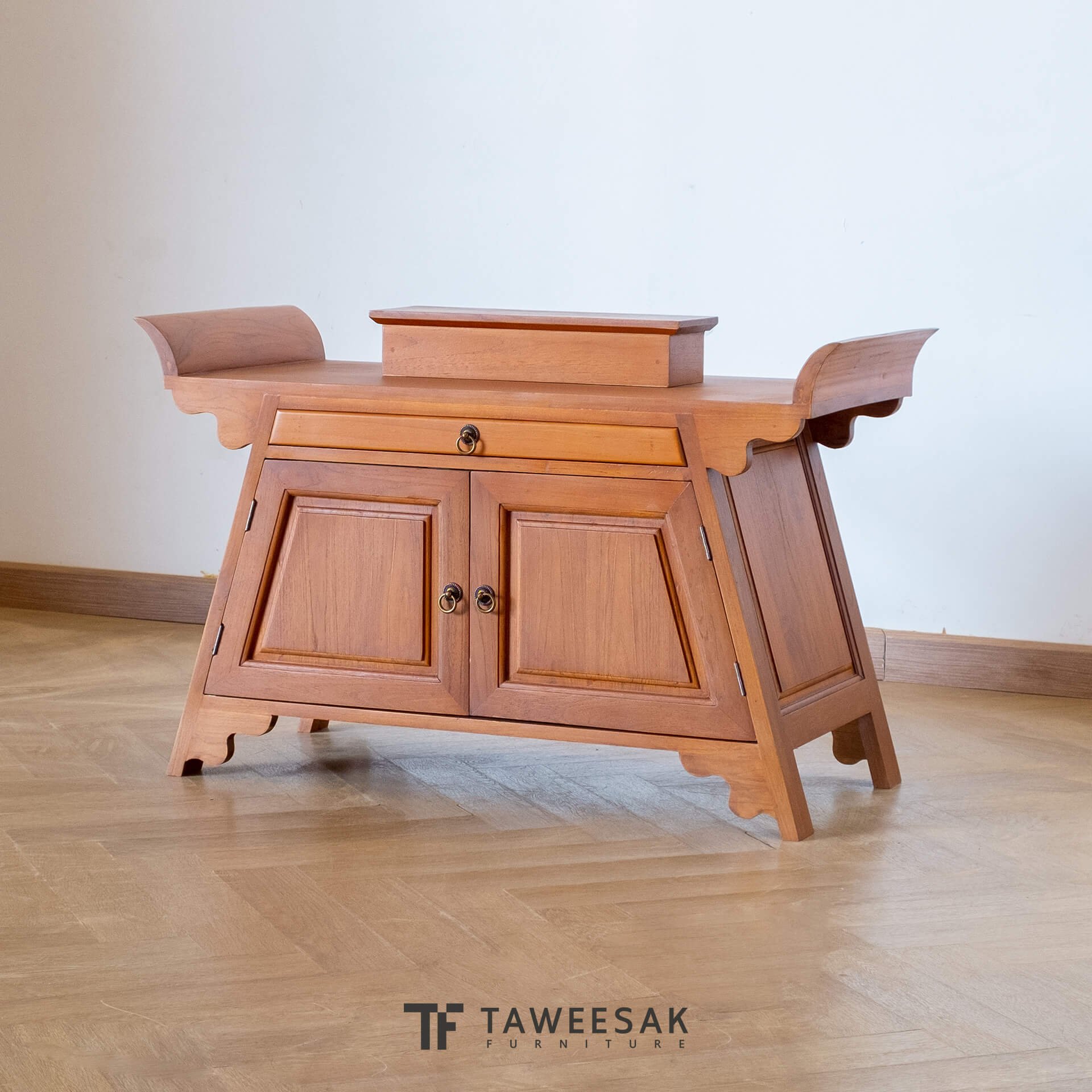 ลักษณะเด่น: มีลิ้นชักและพื้นที่เก็บของด้านล่างสำหรับใส่บทสวดมนต์ ธูป เทียน และอุปกรณ์บูชาต่างๆ อย่างมิดชิด ทำให้ห้องพระดูสะอาดตาอยู่เสมอ