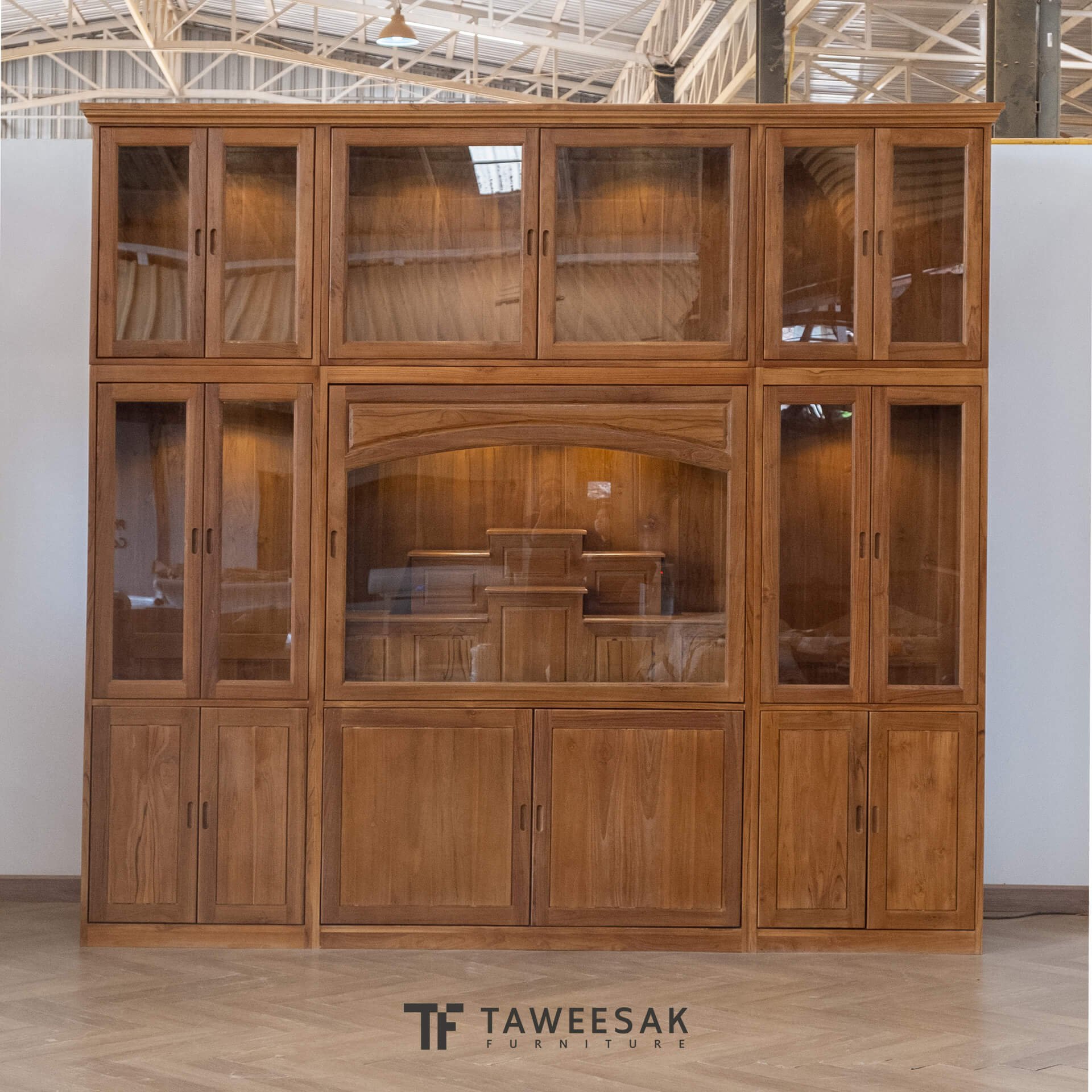 ลักษณะเด่น: ดีไซน์ตู้หมู่ที่มีความอ่อนช้อยของงานไม้สัก เน้นความประณีตของช่างฝีมือ Taweesak Furniture ที่สืบทอดกันมา สำหรับผู้ที่ชื่นชอบความงามแบบดั้งเดิมแต่ยังต้องการโต๊ะหมู่บูชาห้องพระสวย ๆ ที่ดูไม่เก่าจนเกินไป