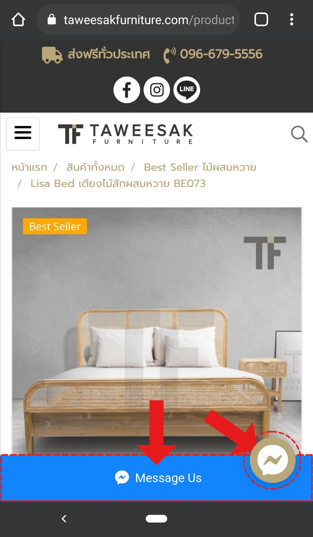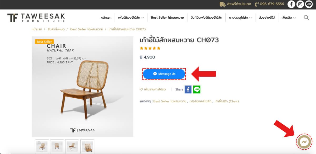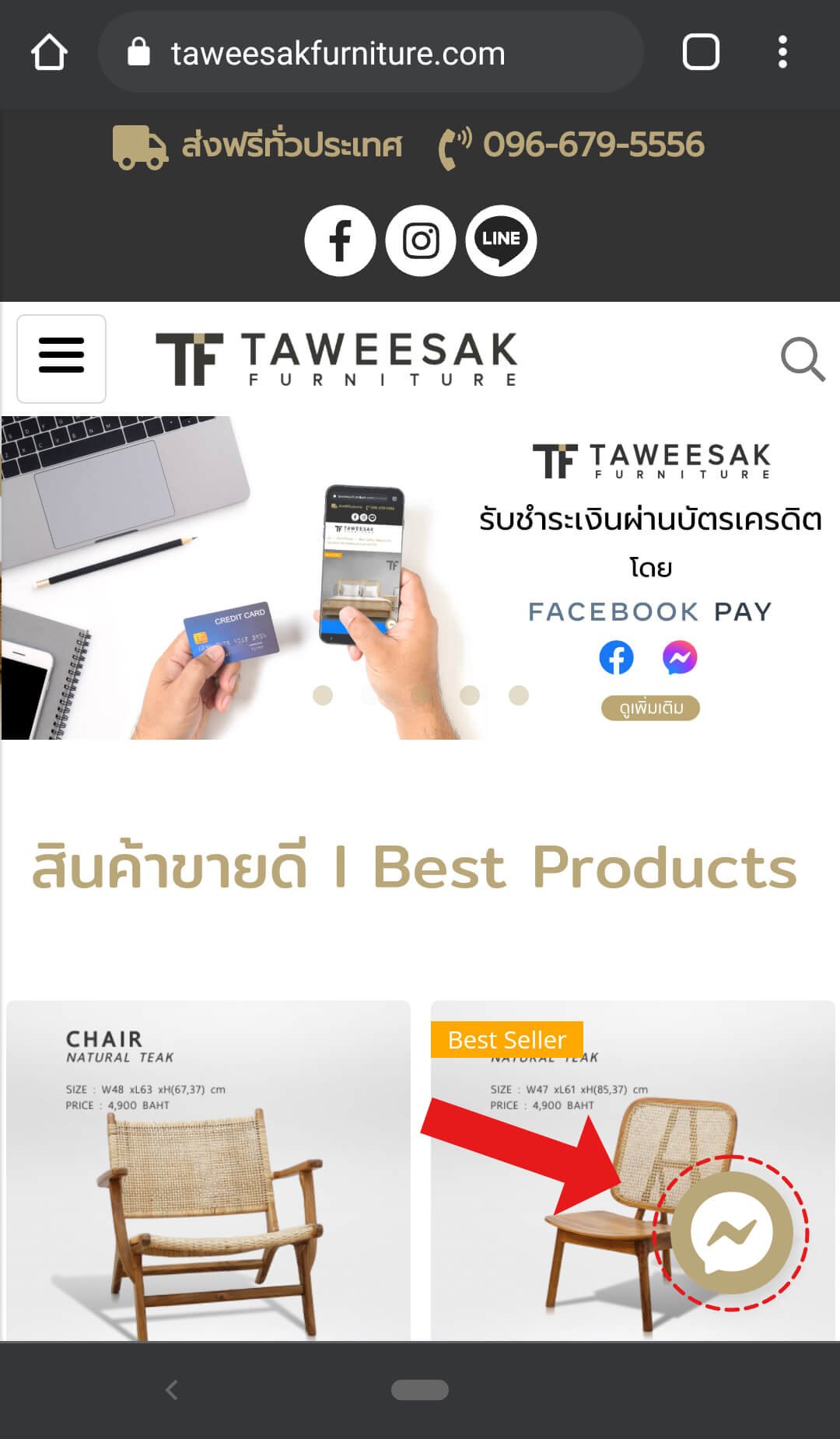 ติดต่อสอบถามราคาสินค้าจากเจ้าหน้าที่ เจ้าหน้าที่จะส่งบิลชำระเงินให้ในแชท Messenger ด้วย Facebook Pay