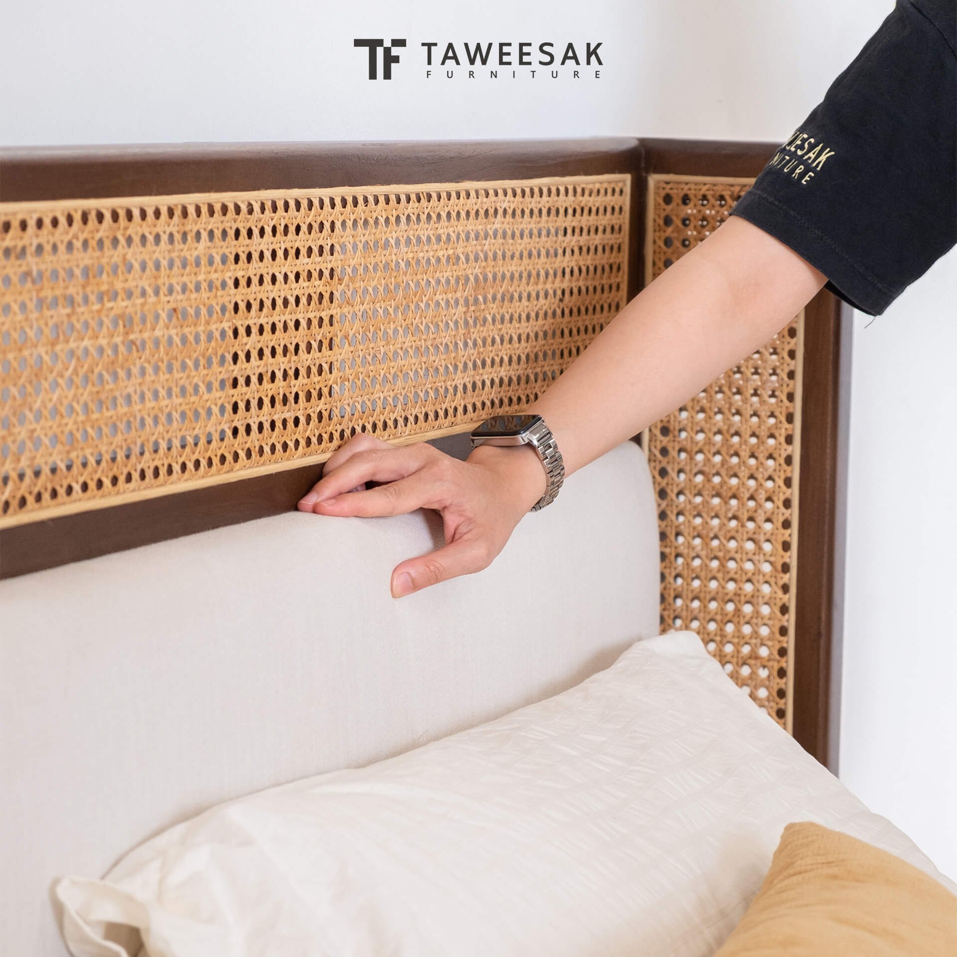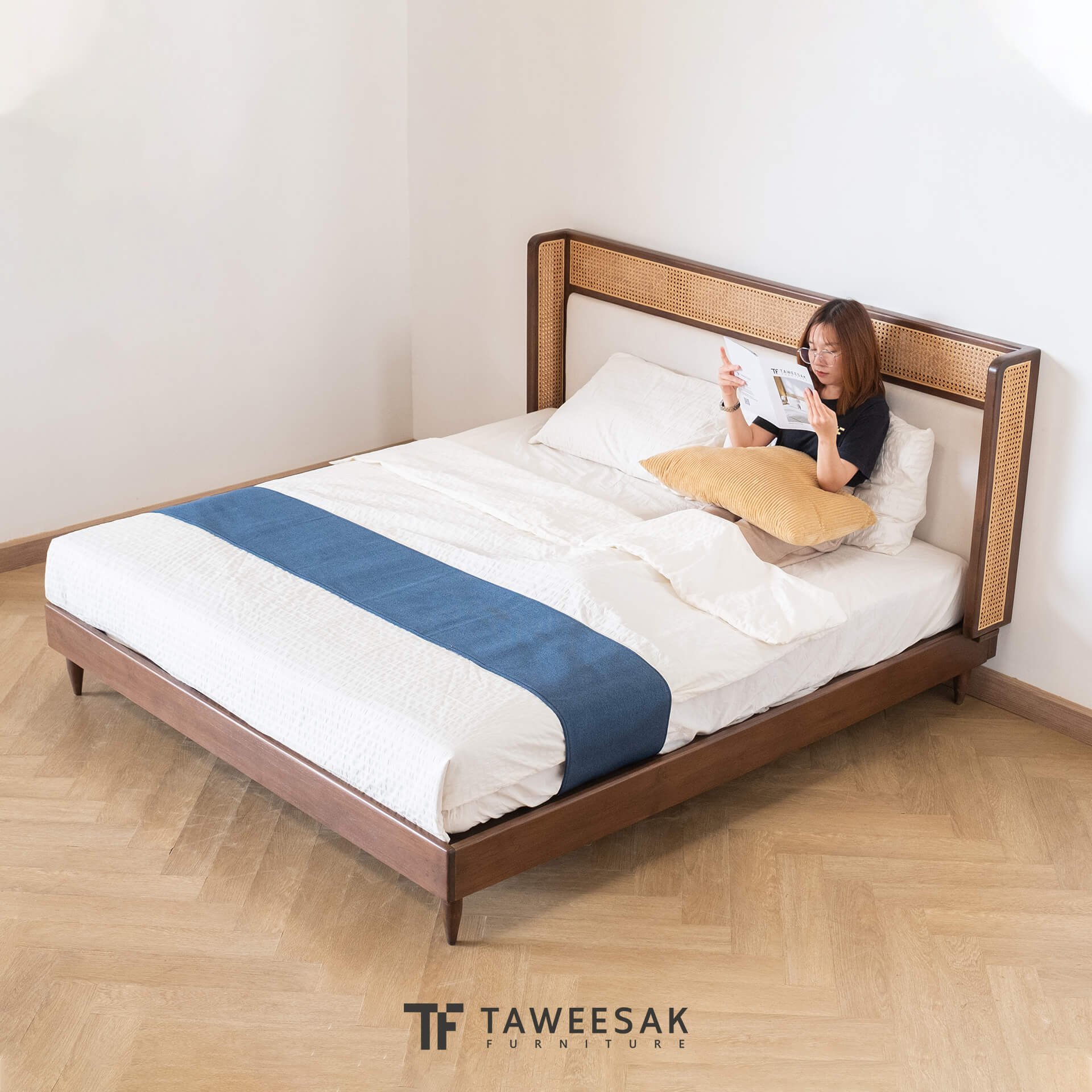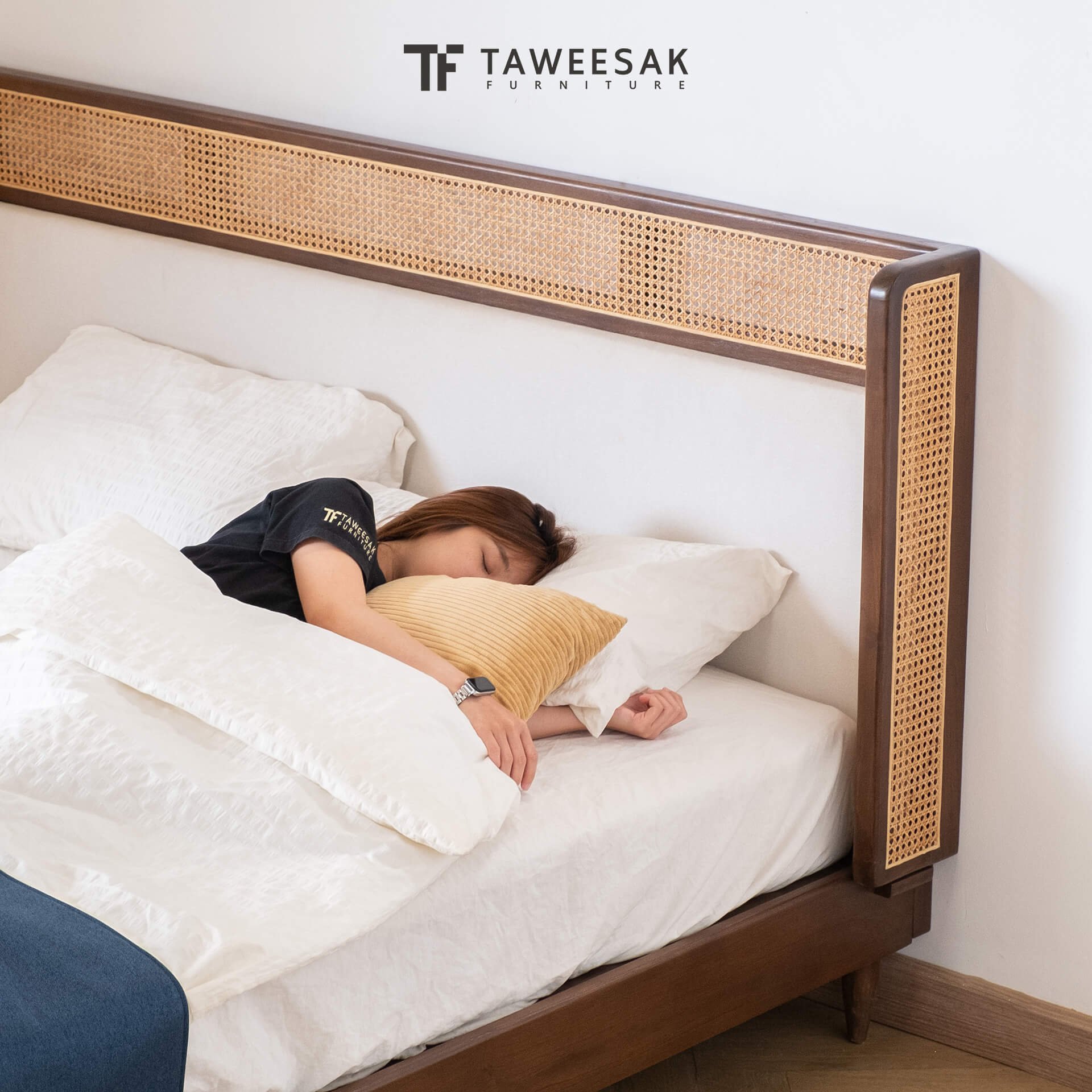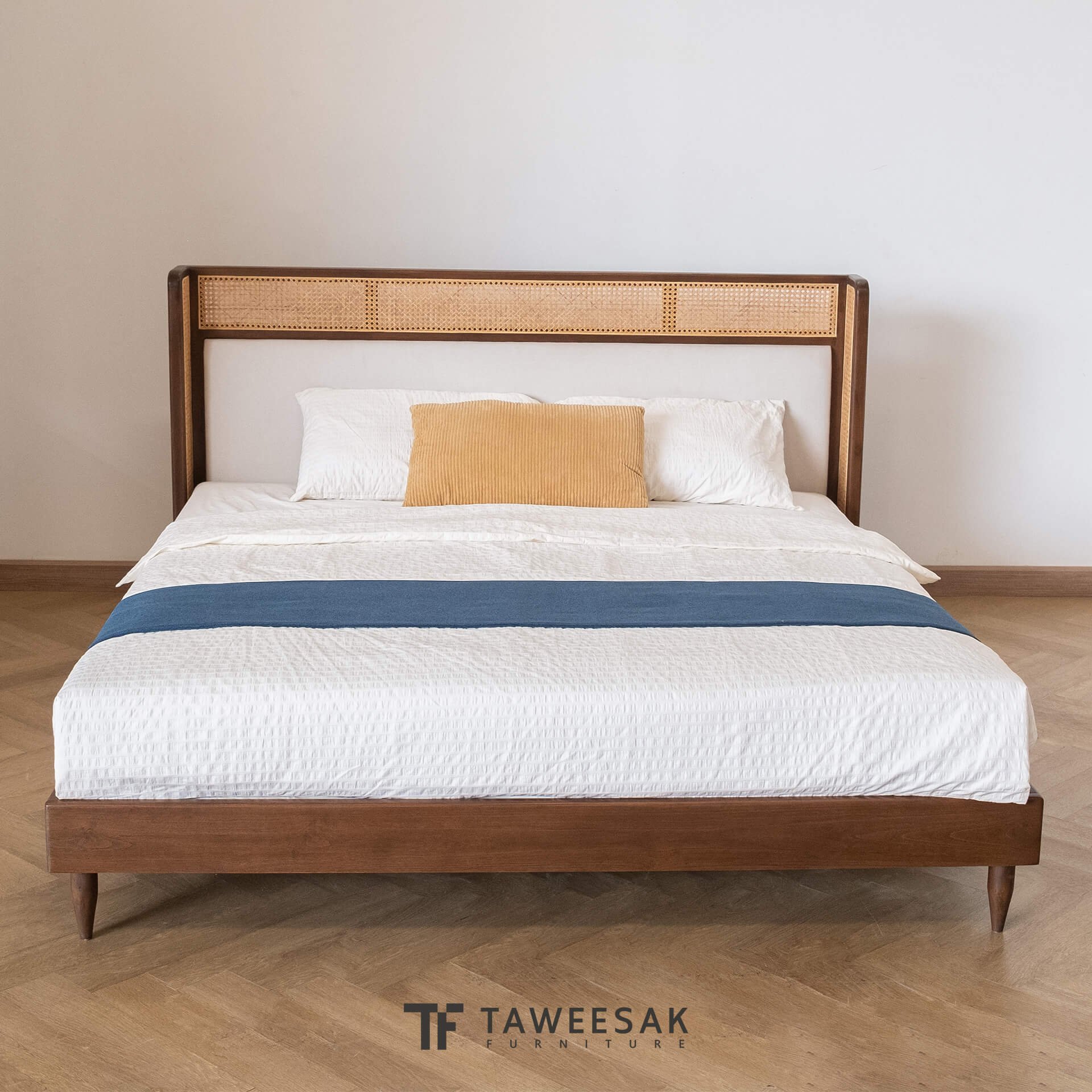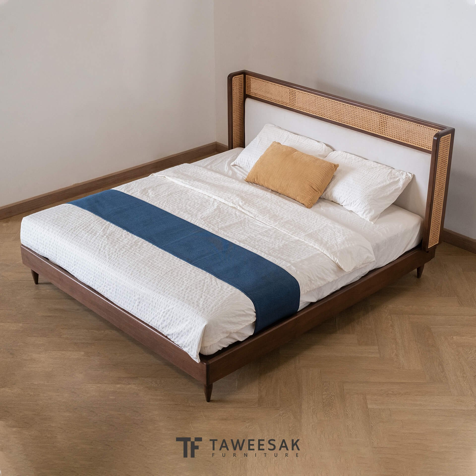 ฐานเตียงเป็นไม้สักระแนงหรือไม้สักต่อกันเป็นแผ่น ขัดเคลือบพ่นผิวหน้าไม้อย่างดี